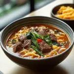 Beef noodle soup is a heartwarming dish that combines tender beef, flavorful broth, and perfectly cooked noodles into a satisfying meal. This iconic comfort food is cherished in many cultures, especially in Asian cuisine where it has become a staple. In just under two hours, you can create a delicious pot of beef noodle soup that will warm your soul and impress your family or guests. The rich flavors come from simmering the beef with aromatic herbs and spices, while the addition of fresh vegetables adds texture and nutritional value to the dish. Whether you’re looking for a cozy dinner on a chilly evening or a hearty meal to share with loved ones, this beef noodle soup recipe is sure to become a favorite in your home. With simple ingredients and straightforward steps, you’ll find that making this comforting bowl of goodness at home is easier than you might think. Let’s dive into why you’ll love this recipe.