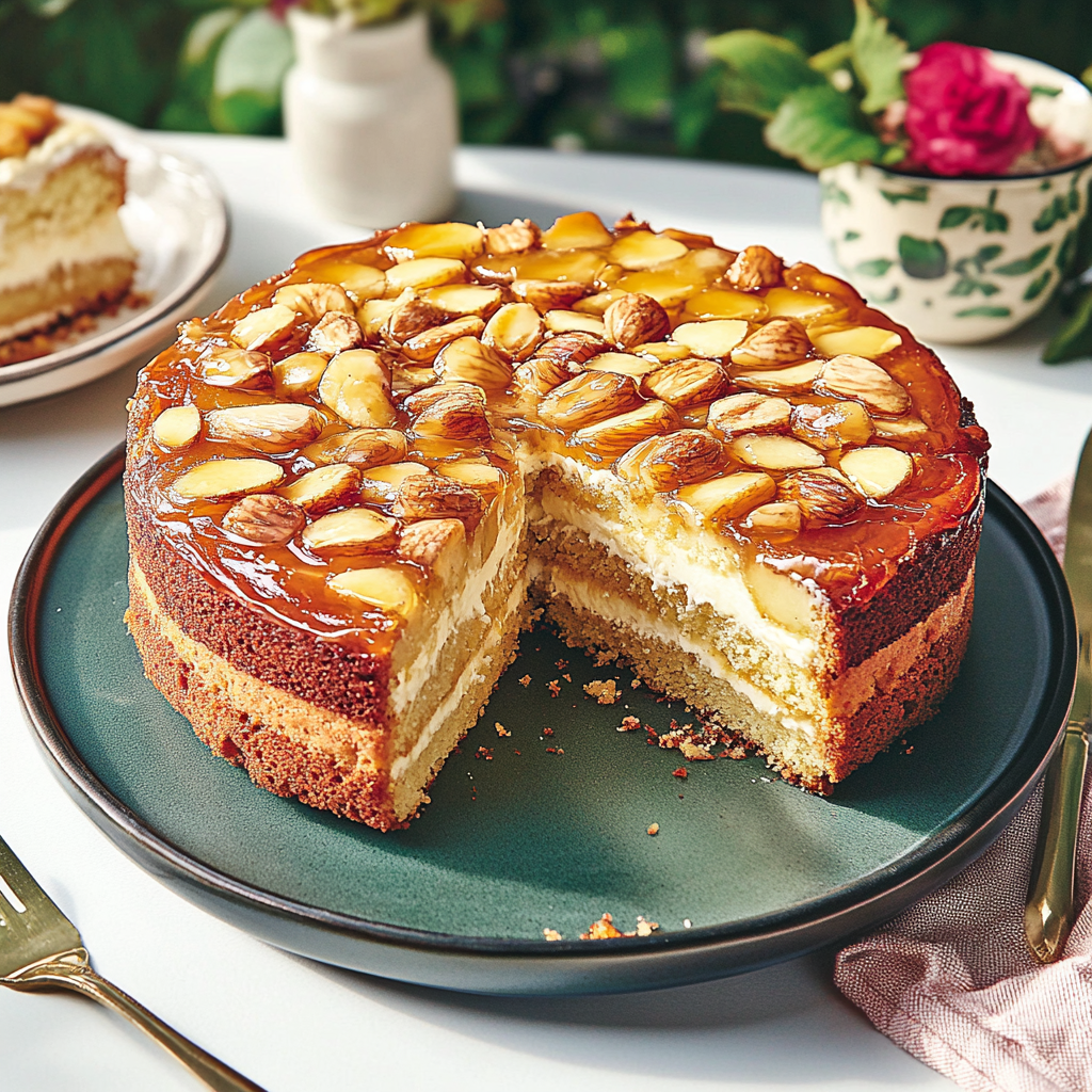 Transfer to plates and serve slices topped with remaining caramelized almonds for the perfect finishing touch.