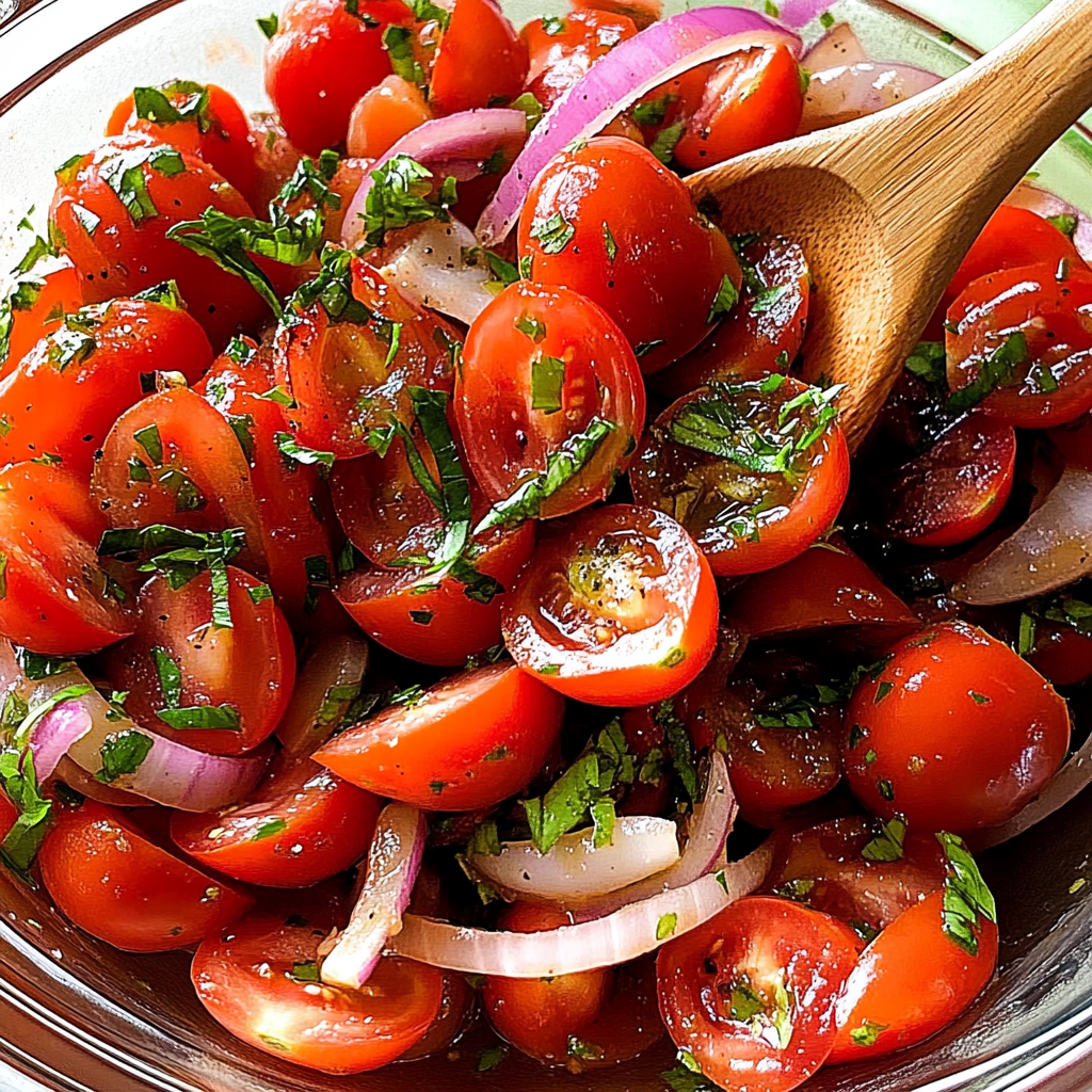 Tomato Garlic Salad is a vibrant and refreshing dish that perfectly captures the essence of summer. With its bright colors and bold flavors, this salad makes an excellent side dish or a light meal on its own. Using ripe, juicy tomatoes and aromatic garlic, this recipe showcases how simple ingredients can come together to create something truly delightful. Not only is this salad quick to prepare, taking just 15 minutes from start to finish, but it also offers a healthy option packed with vitamins and minerals. Garlic Caesar Salad recipe The combination of fresh herbs adds a fragrant touch, making it an ideal addition to any gathering or casual weeknight dinner. Whether you are entertaining guests or simply looking to enjoy a nutritious meal, Tomato Garlic Salad is sure to impress with its delicious taste and appealing presentation. In a world filled with complex recipes, this salad stands out for its simplicity while delivering maximum flavor.